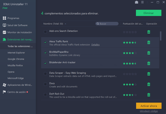 También se encarga de borrar aplicaciones en Windows sin cuenta de administrador o de realizar la desinstalación de una manera rápida y sin errores. IObit Uninstaller proporciona control completo sobre el estado del ordenador y capacidad para que mejores la navegación con opciones como el bloqueo de avisos de notificación.